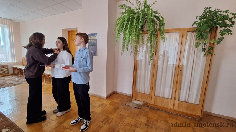 Глава округа Александр Васильев вручил подросткам их первые паспорта и Конституцию РФ, руководитель Движения Первых Темкинского округа Вера Соболева прикрепила памятные значки «Первые»