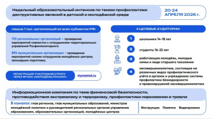 С 20 по 24 апреля 2026 года при поддержке Федеральной службы по финансовому мониторингу пройдёт Всероссийская просветительская акция «Неделя БезОпасности». Цель акции — комплексное информирование молодёжи по вопросам личной и общественной безопасности. В условиях цифровизации и распространения новых форм мошенничества такая работа становится особенно важной.